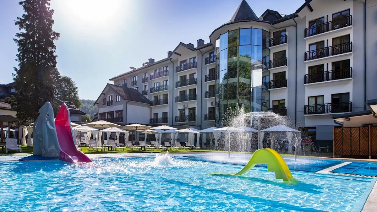 Park Wodny „Zielona wyspa” – basen z podwodnymi hydromasażami, basen rekreacyjny z gejzerami wodnymi, brodzik dla dzieci z ciepłą wodą, różnorodne jacuzzi, zjeżdżalnia o długości 40 metrów, sauna sucha, parowa, laconium, prysznic wrażeń), zewnętrzny basen - „BEZPIECZNA STREFA DZIECKA” z podgrzewaną wodą (brodzik z 3 głębokościami, 2 zjeżdżalnie, grzybek wodny, gejzer, siedziska, ścianka wspinaczkowa), całoroczna balia z podgrzewaną wodą, 20 Gabinetów Odnowy Biologicznej, 5 sal konferencyjnych, restauracja na 400 osób, chata grillowa (do 300 osób), plac zabaw, bezpłatny Internet Bezprzewodowy na pomieszczeniach wspólnych.W cenie pobytu