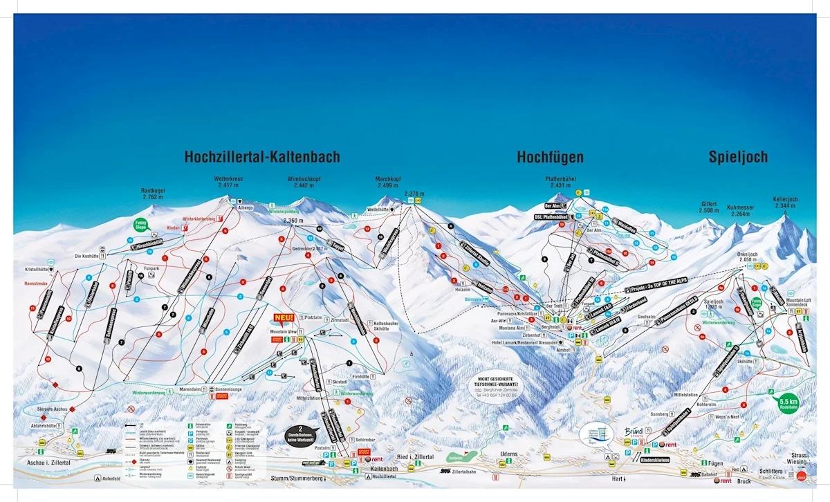 Maks. wysokość: 2378 mMin. wysokość: 600 mWys. miejscowość: 545 mWyciągi łącznie: 42Orczyki: 20Krzesełka: 13Gondole: 9Trasy łącznie: 110 kmTrasy zielone/niebieskie: 44 kmTrasy czerwone: 50 kmTrasy czarne: 16 kmRegion narciarski Zillertaler Superskipass