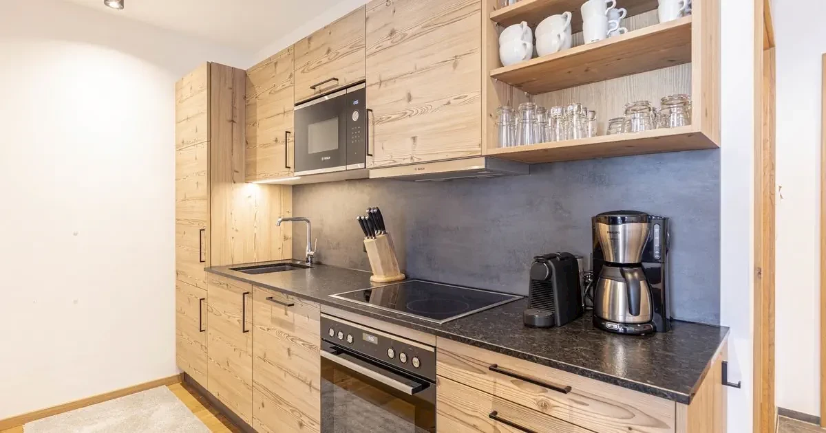 nisza kuchenna wyposażona w lodówkę/zamrażalnik, indukcję, zmywarkę do naczyń, kuchenkę mikrofalową, ekspres do kawy, czajnik i toster