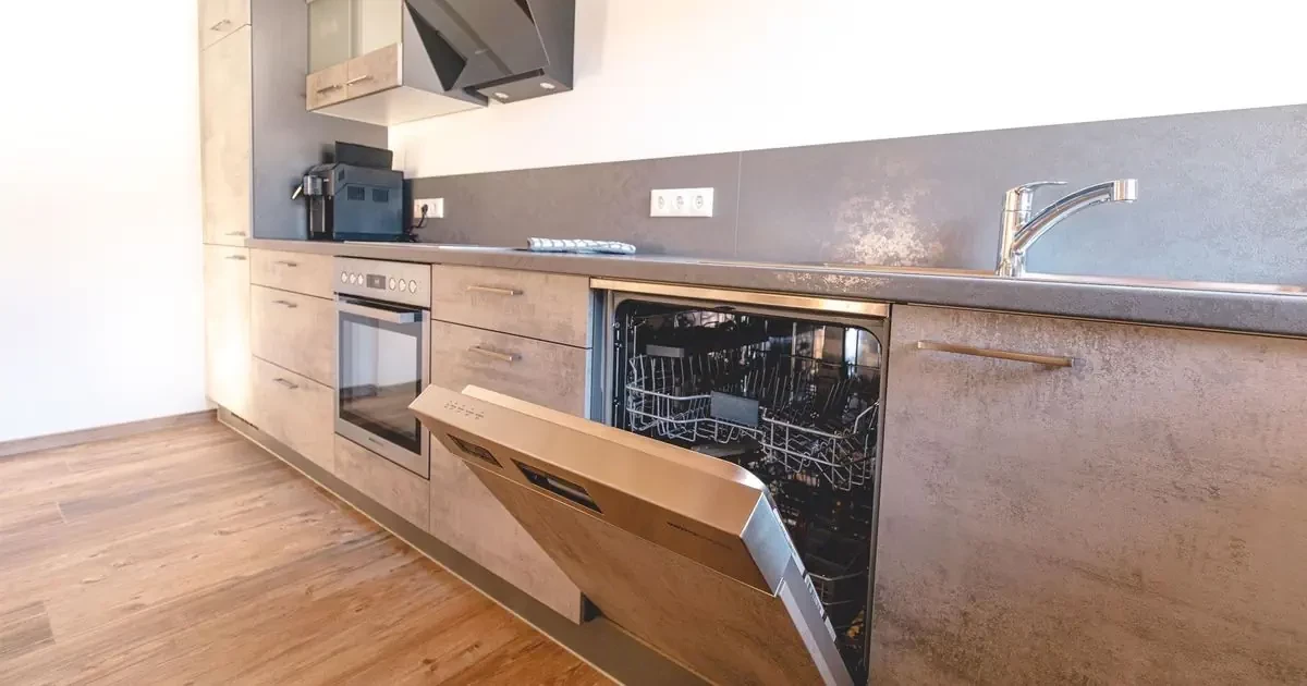 nisza kuchenna wyposażona w lodówkę z zamrażalnikiem, kuchenkę mikrofalową, kuchenkę, piekarnik, zmywarkę, ekspres do kawy, czajnik i toster
