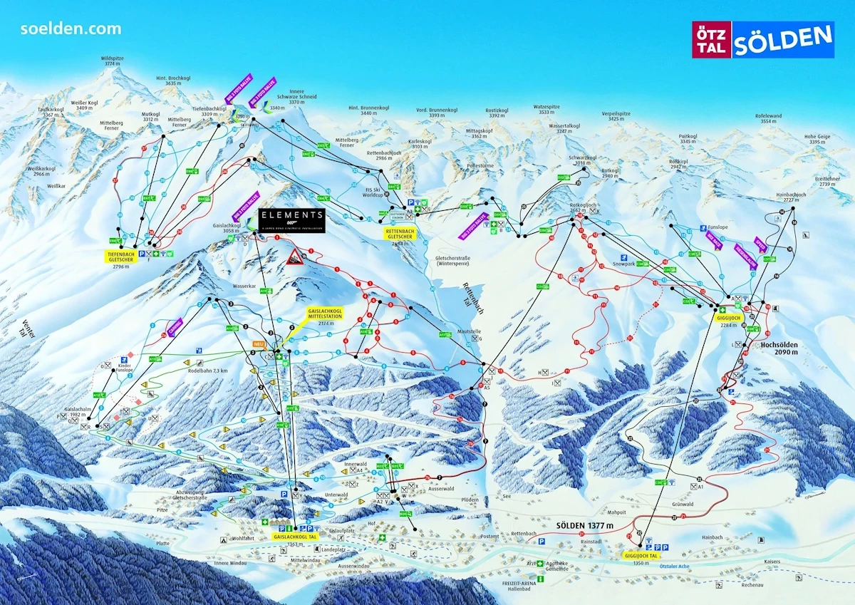 Maks. wysokość: 3340 mMin. wysokość: 1350 mWys. miejscowość: 1180 mWyciągi łącznie: 30Orczyki: 8Krzesełka: 13Gondole: 9Trasy łącznie: 143 kmTrasy zielone/niebieskie: 76 kmTrasy czerwone: 38 kmTrasy czarne: 29 kmRegion narciarski Ötztaler Superskipass