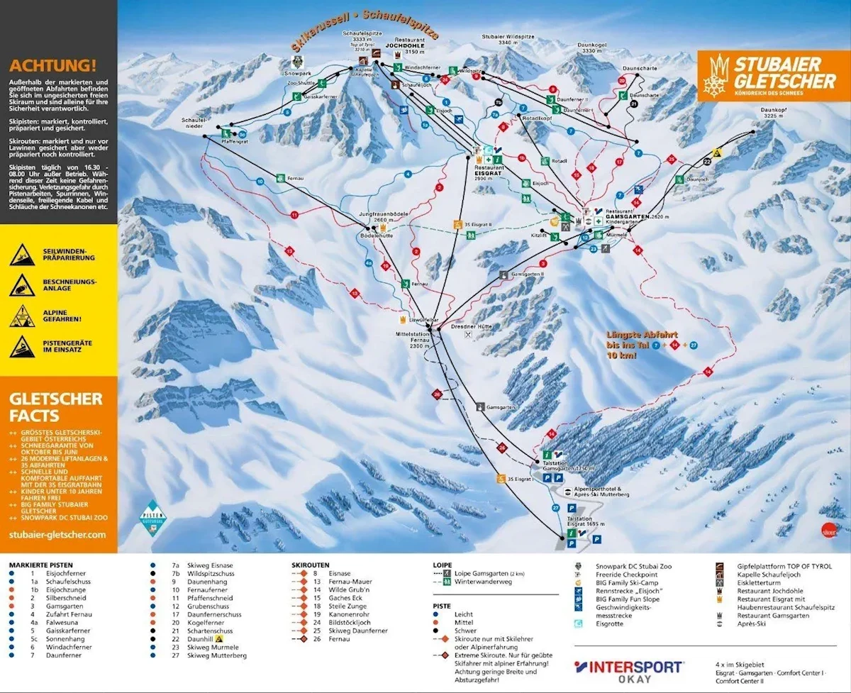 Maks. wysokość: 3210 mMin. wysokość: 1695 mWys. miejscowość: 994 mWyciągi łącznie: 22Orczyki: 10Krzesełka: 7Gondole: 5Trasy łącznie: 47 kmTrasy zielone/niebieskie: 23 kmTrasy czerwone: 22 kmTrasy czarne: 2 kmRegion narciarski Dolina Stubai