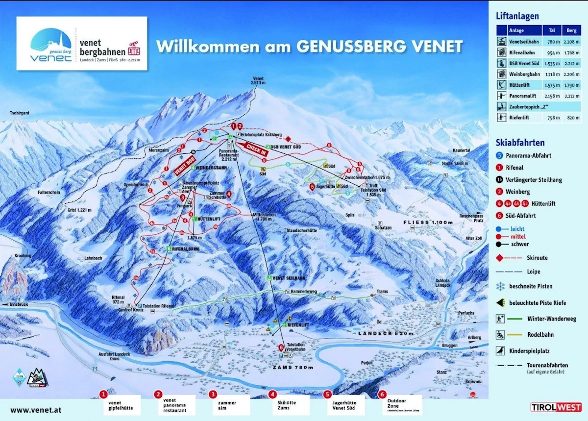 Kolej: Zams (w miejscowości)Przelot: Innsbruck (ok. 70 km), Friedrichshafen (ok. 155 km), Monachium (ok. 200 km), Salzburg (ok. 250 km)Karnet narciarski - dodatkowe informacje.