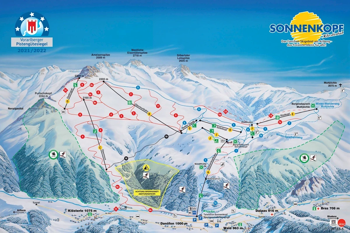 Maks. wysokość: 2300 mMin. wysokość: 1000 mWys. miejscowość: 963 mWyciągi łącznie: 9Orczyki: 4Krzesełka: 4Gondole: 1Trasy łącznie: 30 kmTrasy zielone/niebieskie: 13 kmTrasy czerwone: 16 kmTrasy czarne: 1 kmRegion narciarski Arlberg