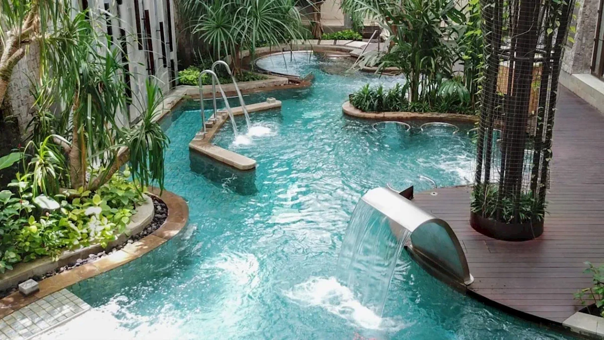 - leżaki i parasole przy basenie