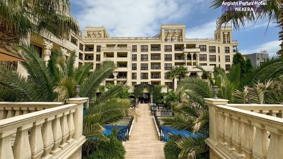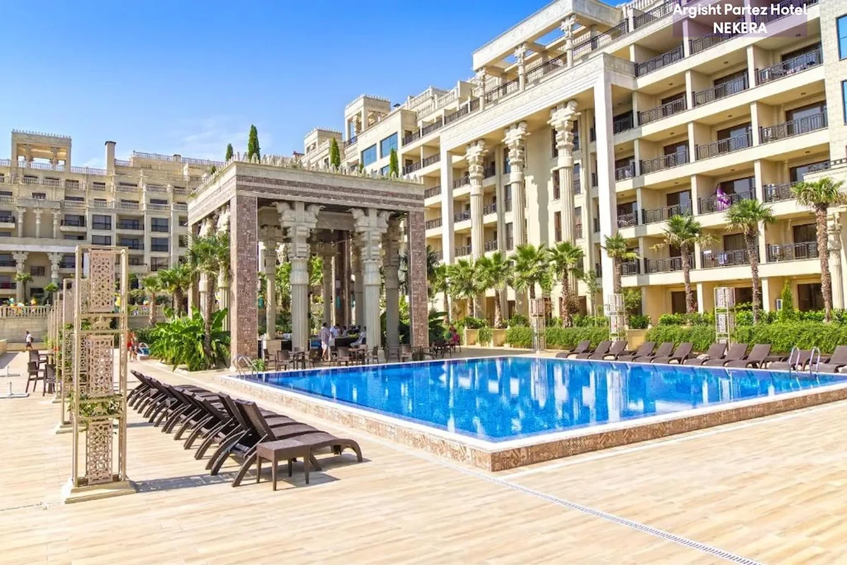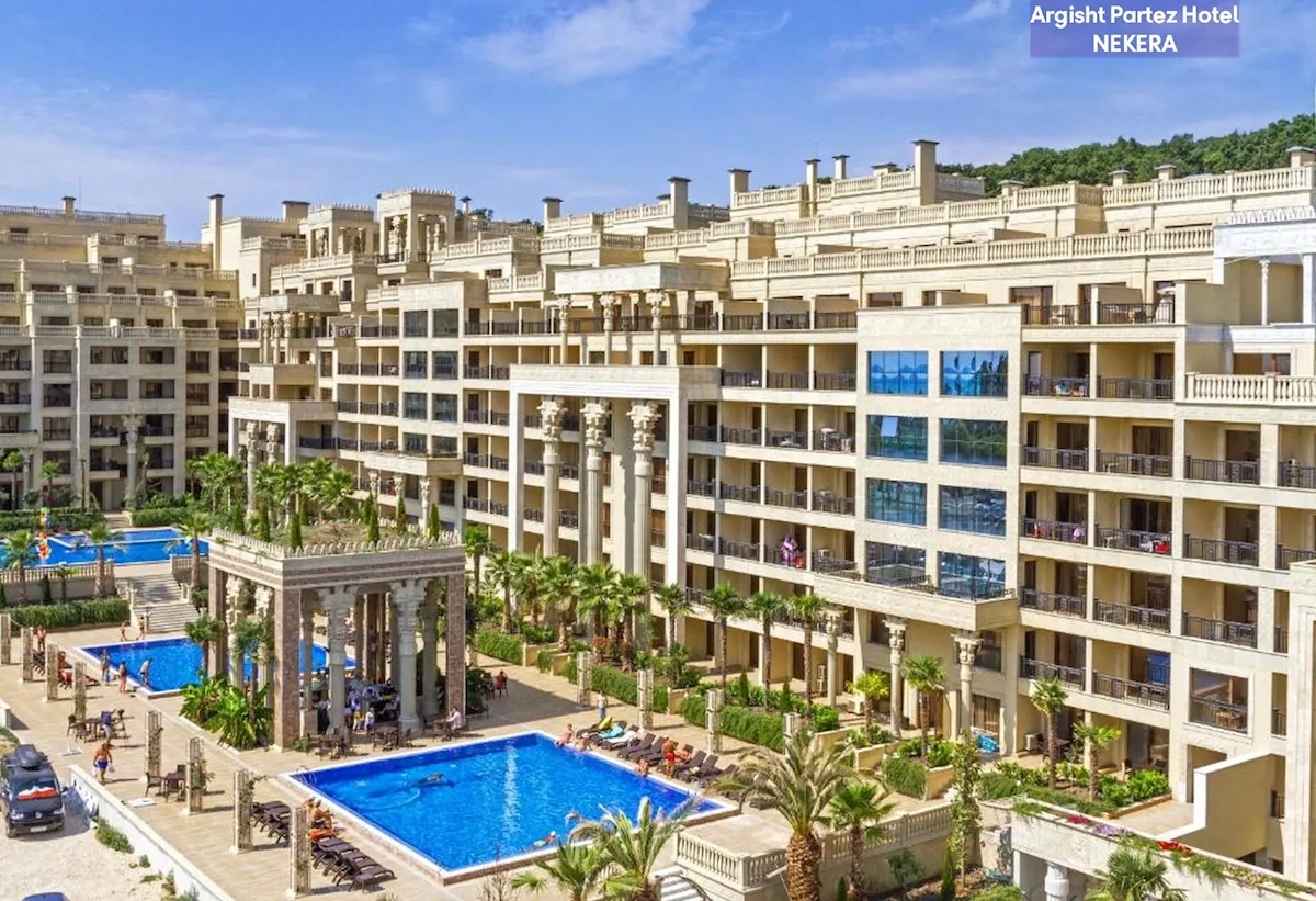 Elegancki, czterogwiazdkowy kompleks hotelowo-apartamentowy inspirowany motywami starożytnej Mezopotamii. Położony w spokojnej części Złotych Piasków, w otoczeniu zieleni, oferuje relaks w stylowych wnętrzach, cztery odkryte baseny oraz komfortowe apartamenty z aneksami kuchennymi. Idealny dla rodzin, par i osób szukających komfortowego wypoczynku blisko plaży, ale z dala od hałaśliwego centrum.