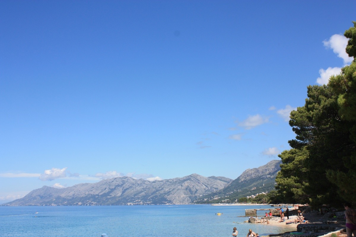 Plaża kamienista, tuż przy niej cień w sosnowym gaju, dużo miejsca. Duży plus – toalety na plaży, funkcjonalne i czyste.