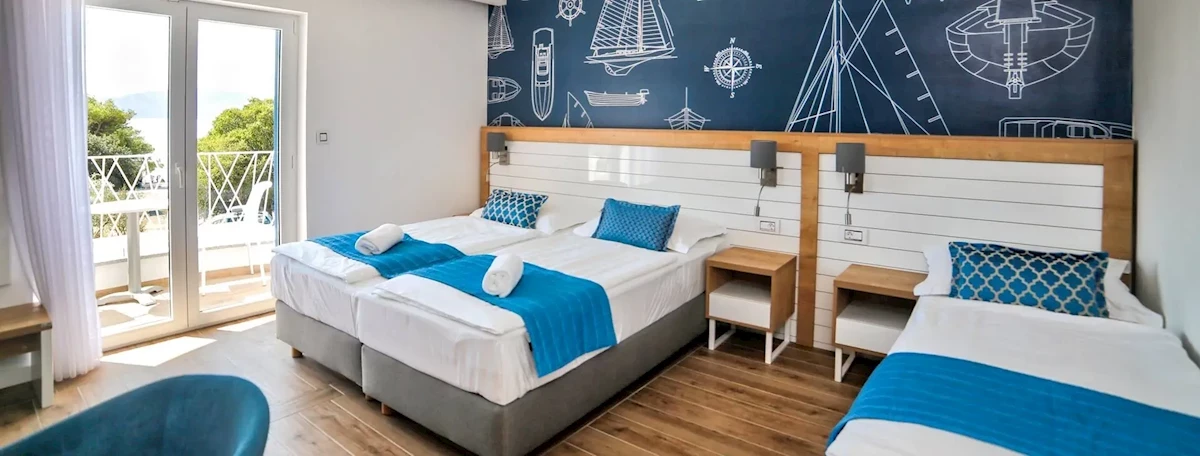 Przestronne, nowe pokoje 2-osobowe (z możliwością 1 dostawki) z łazienką (suszarka), lodówką, TV, klimatyzacją i balkonem od strony morza. Na każdym piętrze znajduje się mały aneks kuchenny. Pokoje rozmieszczone w budynku głównym z restauracją oraz budynku bocznym.