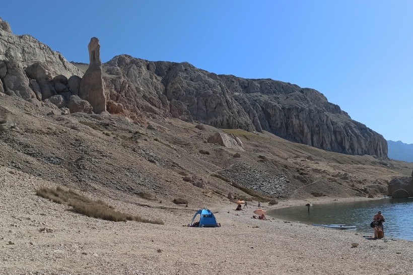Plaża jest pokryta drobnymi kamyczkami, więc polecam leżak – jest trochę ciasno. Wejście do morza jest łagodne, ale kamieniste, więc buty do wody są zdecydowanie odpowiednie. Woda jest pięknie czysta. Wokół plaży rosną stare drzewa, myślę, że jest wystarczająco dużo cienia. W czasie naszych wakacji (początek lipca) plaża zdecydowanie nie była zatłoczona. Pływanie jest również możliwe w aquaparku, który jest wliczony w cenę zakwaterowania, a około połowa domków mobilnych ma własny basen. Biorąc pod uwagę te opcje, nigdzie nie było tłoczno. Niestety, w morzu nie ma wiele do zobaczenia. Kilka ryb i to wszystko. Więc nurkowanie jest kiepskie. Na plaży jest wypożyczalnia desek SUP, motorówek, rowerów wodnych i duży dmuchany zamek w morzu dla dzieci. Są też toalety i przebieralnie. Brakowało mi stoiska z przekąskami na plaży – lody, napoje. Stoisko było, ale zamknięte. Lody można było kupić w aquaparku.
