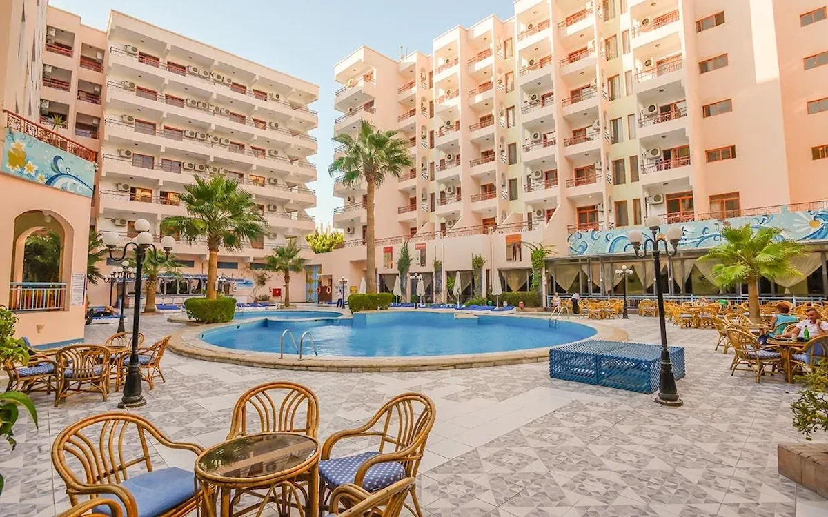 Empire Hotel Aqua Park położony jest w starej części Hurghady, ok. 400 metrów od morza. Składa się z 3 siedmiopiętrowych budynków i posiada łącznie 224 pokoje. Goście mogą się relaksować nad basenie, zadbać o formę na siłowni lub cieszyć się czasem wolnym korzystając z programu sportowego i rozrywkowego. Hotel jest odpowiedni na niedrogie wakacje w Egipcie.