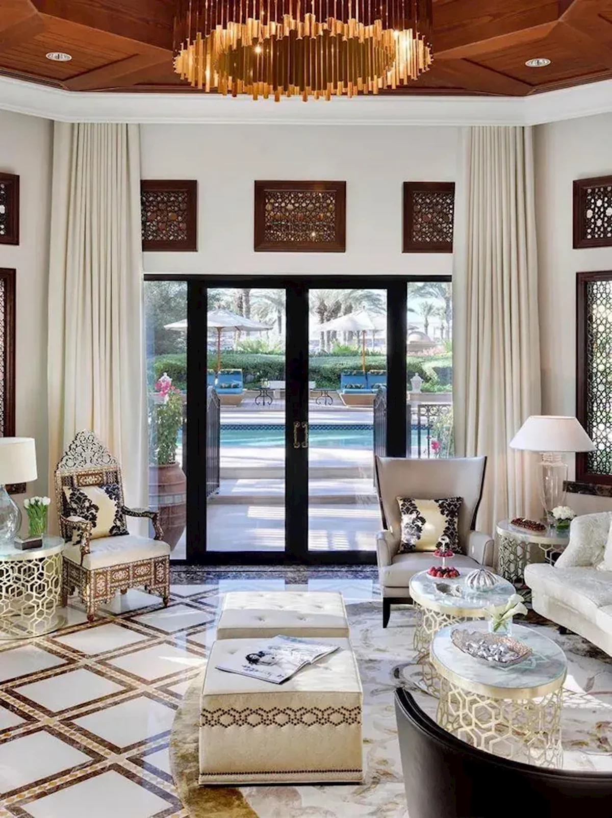 wytworny hotel, który składa się z 3 budynków; Arabian Court, The Palace, The Residence, do dyspozycji gości; lobby z recepcją, basen zewnętrzny, restauracje, bary, SPA. Hotel nie akceptuje zwierząt. *Depozyt hotelowy; 500 AED/noc/pokój.
