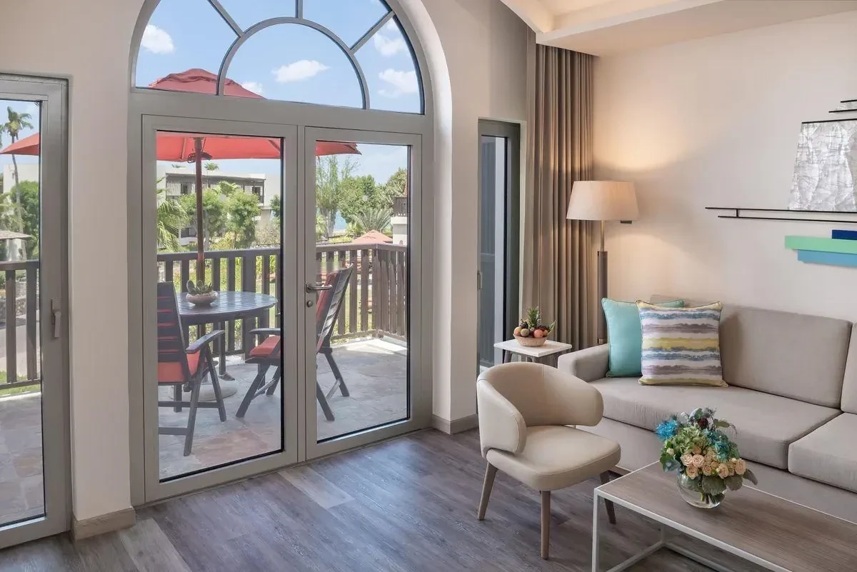 Junior Suite (SeaView) - sypialnia z częścią wypoczynku dziennego, łazienka, balkon z widokiem na zatokę, powierzchnia - ok. 60 m kw.Beachfront Junior Suite (Terrace) - sypialnia z częścią wypoczynku dziennego, łazienka, taras z widokiem na ogród, plażę, zatokę, powierzchnia - ok. 62 m kw. Usytuowanie na parterze.