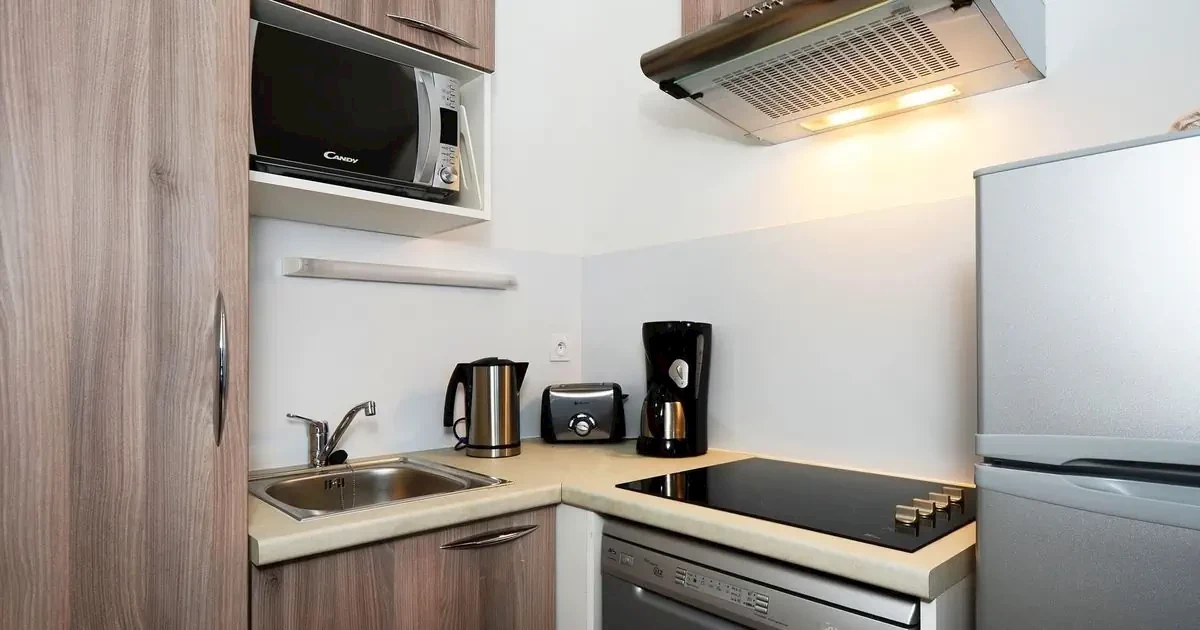 kuchnia z płytą ceramiczną, lodówką, kuchenką mikrofalową i zmywarką do naczyń