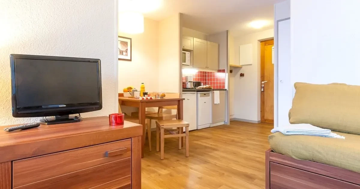 pokój dzienno-sypialny z 2 pojedynczymi kanapami do spania i TVnisza sypialna z łóżkiem piętrowym (zlecane dla dzieci)balkonApartament 4-osob. (ok. 28 m2), SC, A4O1