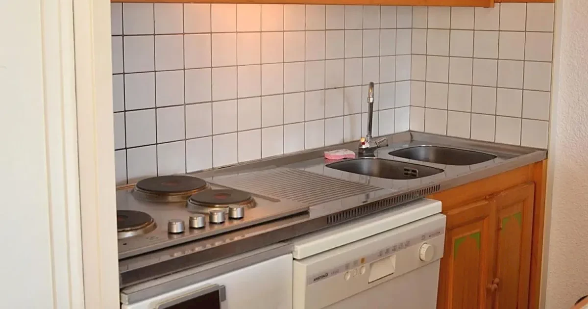 nisza kuchenna z lodówką, kuchenką mikrofalową, zmywarką do naczyń i kuchenką 4-palnikową