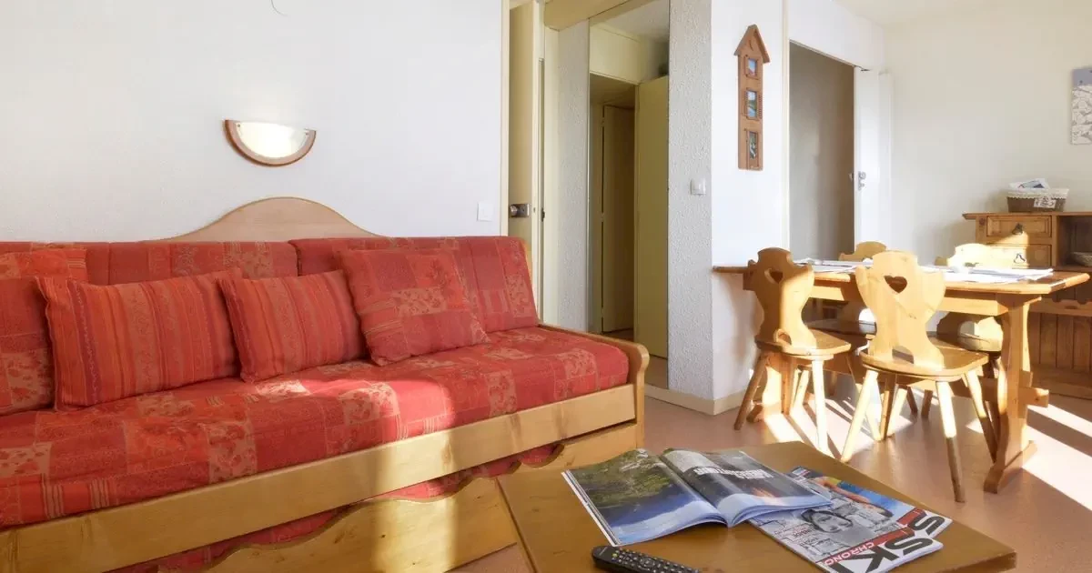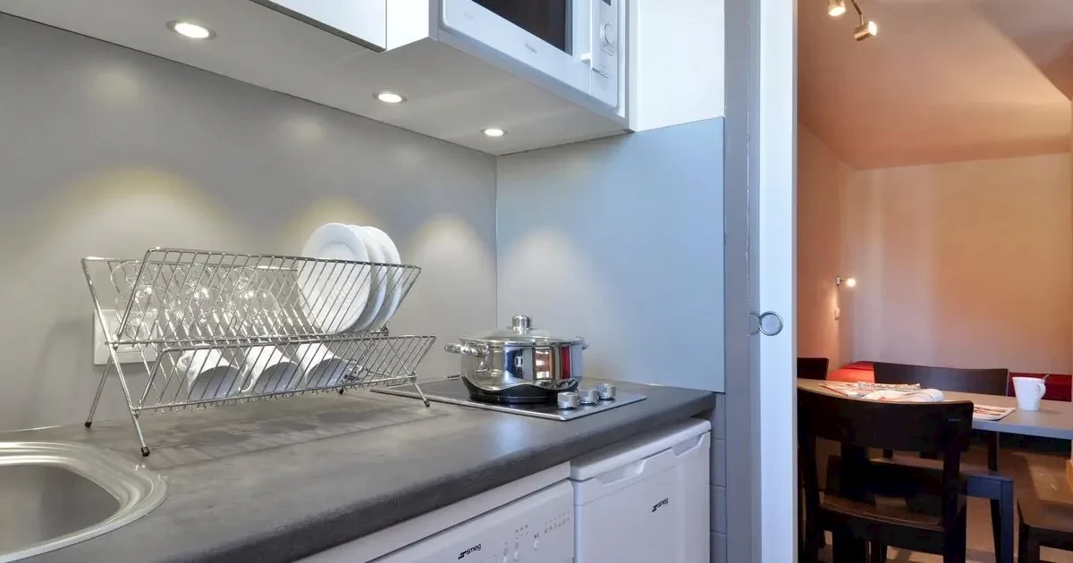 pokój dzienno-sypialny z podwójną rozkładaną kanapą, dwoma łóżkami pojedynczymi i TVnisza kuchenna z lodówką, kuchenką mikrofalową, mini-piekarnikiem, zmywarką do naczyń i 3-palnikową kuchenką ceramiczną