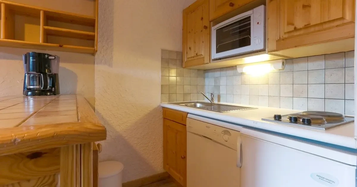 nisza kuchenna z lodówką, kuchenką, kuchenką mikrofalową lub mini piekarnikiem, zmywarką, ekspresem do kawy, czajnikiem i tosterem