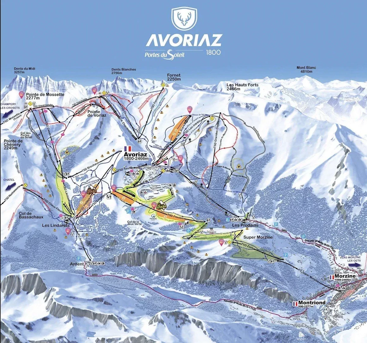 Maks. wysokość: 2225 mMin. wysokość: 970 mWys. miejscowość: 1800 mWyciągi łącznie: 35Orczyki: 14Krzesełka: 18Gondole: 3Trasy łącznie: 53 kmTrasy zielone/niebieskie: 30 kmTrasy czerwone: 16 kmTrasy czarne: 7 kmRegion narciarski Les Portes du Soleil