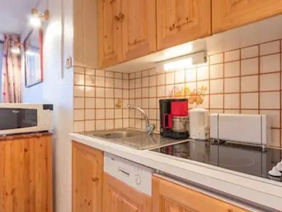 nisza kuchenna z kuchenką, kuchenką mikrofalową, mini-piekarnikiem, zmywarką do naczyń, czajnikiem elektrycznym, ekspresem do kawy, tosterem, urządzeniem do raclette i fondue