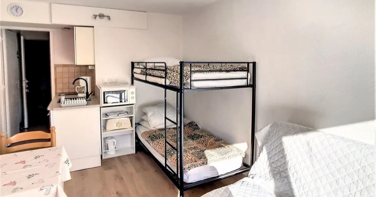 pokój dzienno-sypialny z niszą kuchenną, podwójną sofą rozkładaną, łóżkiem piętrowym i TV