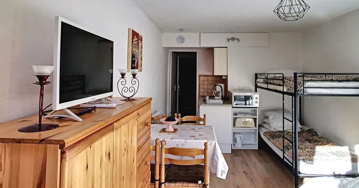 pokój dzienno-sypialny z niszą kuchenną, podwójnym składanym łóżkiem, łóżkiem piętrowym (oddzielone zasłoną) i TV plazmowym