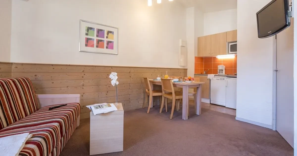 pokój dzienno-sypialny z kuchnią, podwójną kanapą sypialną, pojedynczą kanapą sypialną, łóżkiem rozkładanym (zalecane dla dzieci) i TV