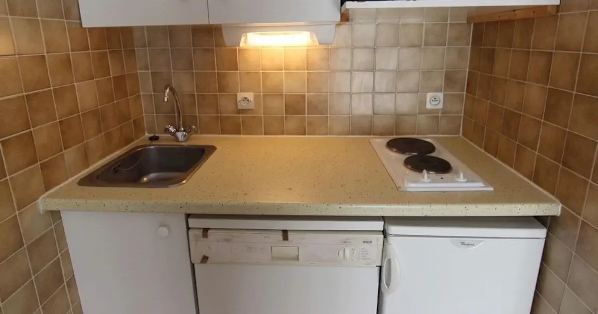 nisza kuchenna z mini piekarnikiem, kuchenką mikrofalową, lodówką, kuchenką i zmywarką do naczyń