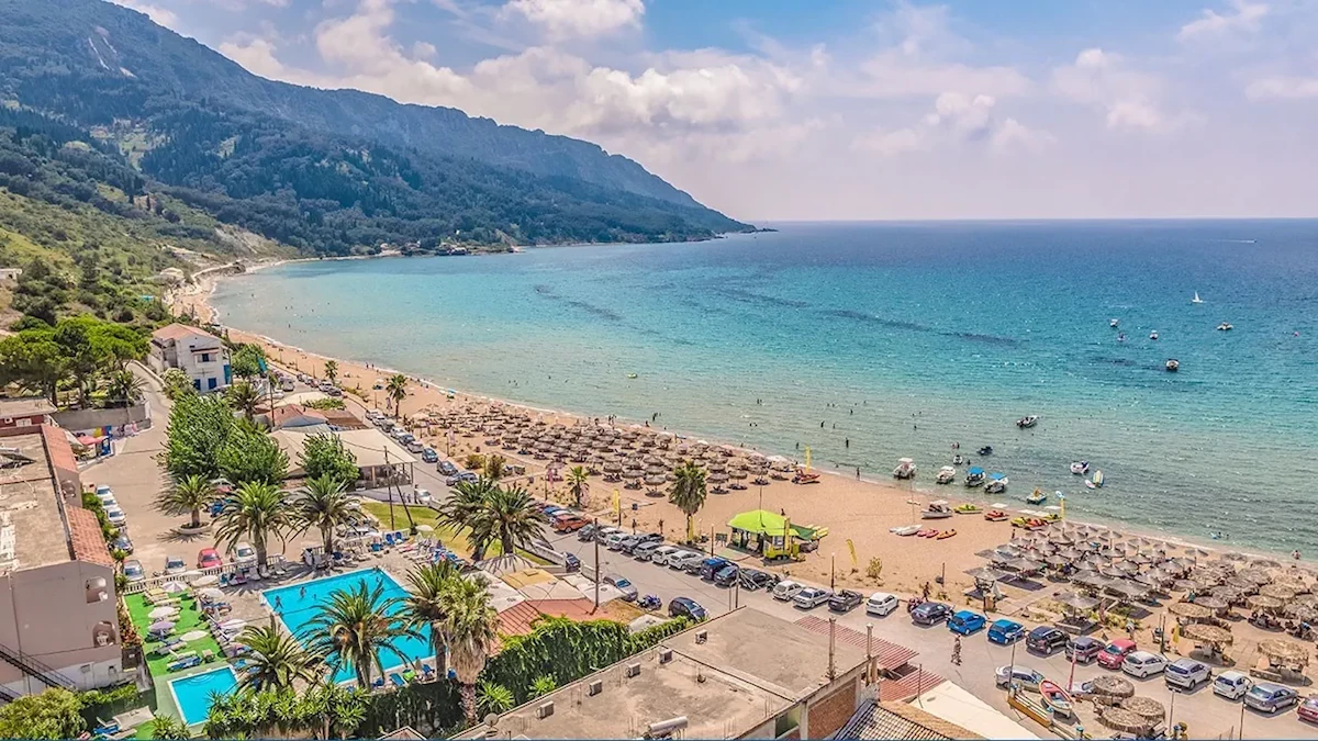 Agios Georgios w północnej części wyspy, w pobliżu licznych tawern, kawiarni i