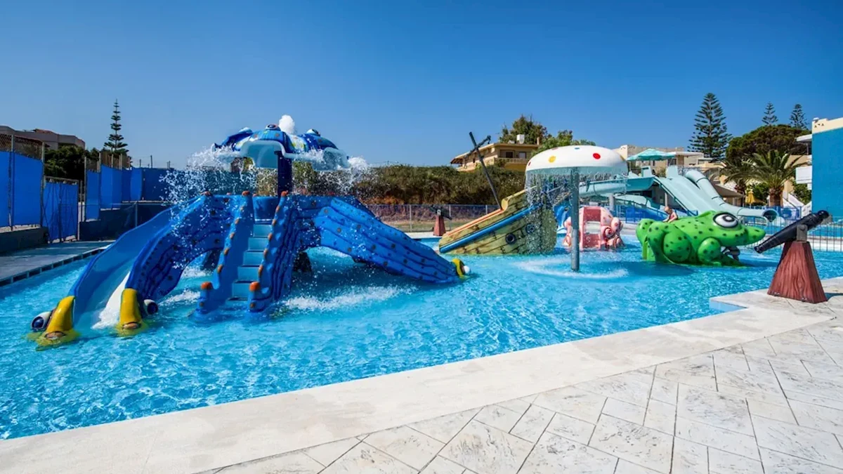 Kompleks dysponuje rozbudowaną infrastrukturą wypoczynkową, która obejmuje cztery baseny zewnętrzne ze słodką wodą, w tym basen ze zjeżdżalniami, basen tylko dla dorosłych (18+), brodzik dla dzieci oraz aquapark Water World z dodatkowymi atrakcjami wodnymi. Przy basenach dostępne są leżaki i parasole, a także bar serwujący napoje i przekąski. Na terenie obiektu znajdują się ogrody, tarasy słoneczne oraz przestrzeń rekreacyjna. Hotel nie posiada klasycznego centrum SPA ani strefy wellness z sauną czy jacuzzi, ale oferuje gościom siłownię oraz możliwość gry w minigolfa i golfa. Do dyspozycji gości pozostaje główna restauracja z kuchnią grecką i regionalną, sala śniadaniowa, a także trzy bary, w tym bar przekąskowy i bar przy basenie. Na terenie obiektu dostępne są minimarket, sklep z pamiątkami oraz parking niezadaszony. Goście mogą korzystać z bezpłatnego Wi-Fi w przestrzeniach wspólnych, recepcji czynnej całą dobę, przechowalni bagażu oraz sali telewizyjnej. W Grecji stosuje się gniazdka elektryczne typu C i F o napięciu 230 V, które są w pełni kompatybilne z polskimi wtyczkami.Zakwaterowanie