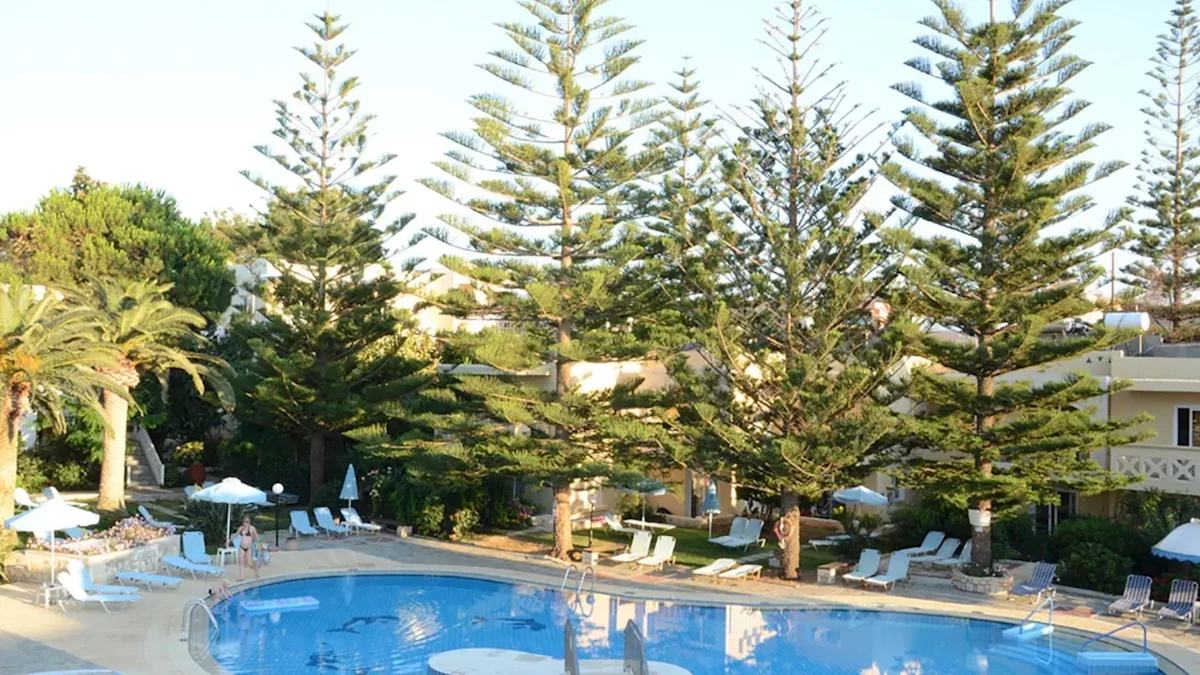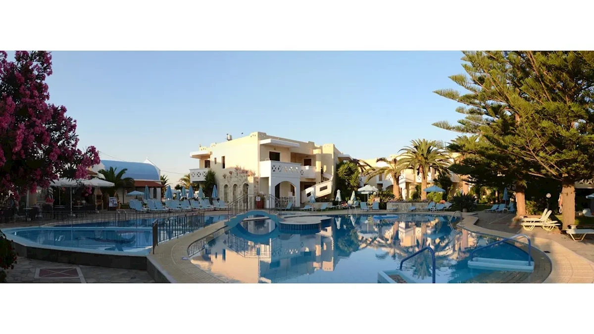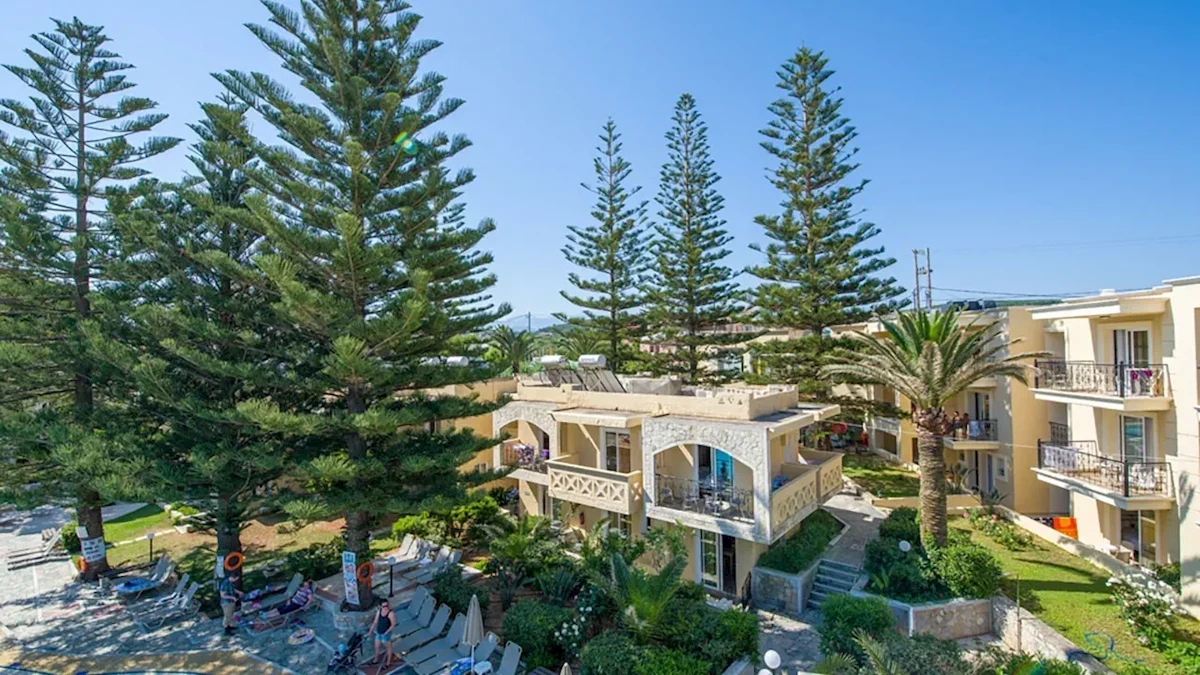 Obiekt oferuje łącznie 100 pokoi, rozlokowanych w kilku niskich budynkach otoczonych ogrodem i tarasami słonecznymi. Budynki mają od dwóch do trzech pięter i nie są wyposażone w windy. Goście mogą wybierać spośród apartamentów rodzinnych oraz pokoi typu studio. Apartamenty (ok. 40–45 m²) składają się z sypialni oraz pokoju dzienno-sypialnego, dzięki czemu doskonale sprawdzają się dla rodzin. Studia (ok. 25–28 m²) to przestronne pokoje dzienno-sypialne z możliwością zakwaterowania do trzech osób. Wszystkie pokoje mają balkon lub taras z miejscem do wypoczynku oraz aneks kuchenny wyposażony w kuchenkę mikrofalową i podstawowe naczynia, co pozwala na samodzielne przygotowanie posiłków. Wyposażenie obejmuje klimatyzację indywidualnie sterowaną, telewizor z kanałami satelitarnymi, telefon, sejf, a także łazienkę z wanną lub prysznicem, WC i podstawowym zestawem kosmetyków. Internet Wi-Fi działa bezpłatnie w przestrzeniach ogólnodostępnych, natomiast w pokojach zasięg może być ograniczony. Na życzenie hotel zapewnia łóżeczka dziecięce. Sprzątanie odbywa się pięć razy w tygodniu, natomiast ręczniki i pościel wymieniane są regularnie. Zwierzęta domowe nie są akceptowane.Wyżywienie