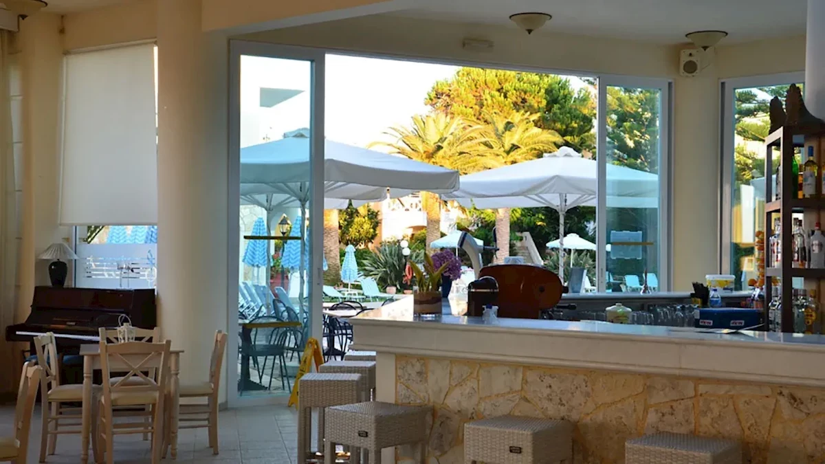 Goście mają do wyboru pobyt ze śniadaniami w formie bufetu lub opcję bez wyżywienia. Posiłki można przygotowywać samodzielnie korzystając z aneksów kuchennych w pokojach i apartamentach. Śniadania serwowane są codziennie w sali śniadaniowej w godzinach 07:30–10:00. Główna restauracja hotelowa działa w formule à la carte, oferując dania kuchni greckiej i regionalnej, a także potrawy międzynarodowe. Dostępne są również dania wegetariańskie i wegańskie, a na życzenie przygotowywane są posiłki dla osób z alergiami pokarmowymi. Dla najmłodszych gości hotel zapewnia foteliki dziecięce oraz specjalne menu z prostymi i lekkimi daniami. Na terenie hotelu działają 3 bary: bar przekąskowy, bar przy basenie zewnętrznym oraz lobby bar. Serwowane są w nich zarówno napoje bezalkoholowe, jak i lokalne alkohole. W barze przy basenie można w ciągu dnia zamówić drobne przekąski i koktajle.Usługi