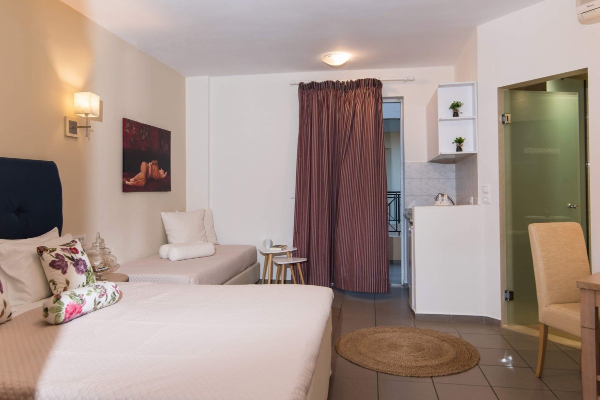 Etwa 650 m vom Sand-/Felsstrand entfernt liegt das Hotel Mirage Studios (Adults only), das besonders beliebt bei Hochzeitsreisenden ist. Am Strand sind Sonnenschirme und Sonnenliegen gegen Gebühr verfügbar. Zum touristischen Zentrum sind es ca. 500 m. Die Stadt Heraklion ist ca. 33 km entfernt (Hersonissos ca. 8,4 km). Ein Supermarkt ist nach ca. 400 m zu erreichen. Die nächstgelegenen Bars und Restaurants erreichen Sie nach rund 46 m. Zur nächsten Diskothek gelangt man nach rund 260 m. Folgende Sehenswürdigkeiten sind vom Hotel aus erreichbar: Knossos Archaeological Site, Minoan Archaeological Site of Malia, Lychnostatis Museum und Crete Aquarium. Für Mobilität im Urlaub sorgen neben einem Mietwagen-Verleih auch ein Motorrad-Verleih, ein Taxistand (ca. 500 m) und eine Bushaltestelle (ca. 550 m entfernt). Zur ärztlichen Versorgung im Notfall befindet sich ein Krankenhaus in etwa 30,7 km Entfernung. Der Flughafen (HER) ist ca. 30 km entfernt. Zwischen Hotel und Flughafen verkehrt ein Shuttle (gegen Gebühr). Ein weiterer Flughafen (CHQ) liegt in etwa 180 km Entfernung.