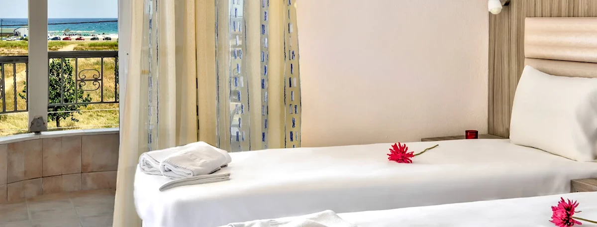Plaża oddalona o ok. 300 m od hotelu. Piękna, piaszczysta i szeroka. Leżaki i parasole dodatkowo płatne ok. 6 EUR/komplet lub bezpłatne przy zamówieniu czegoś w barze plażowym. Na plaży dostępny bar plażowy.Do dyspozycji gości