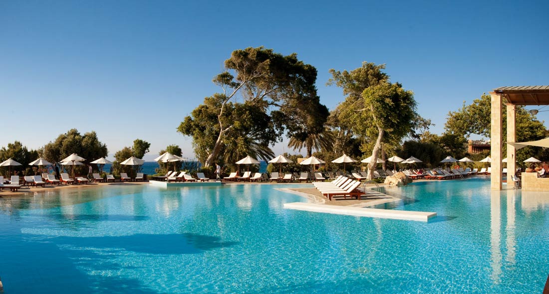 Duży kompleks oferujący pokoje, apartamenty oraz wille, położony przy plazy, oferuje posiłki kuchni greckiej i międzynarodowej.Położenie