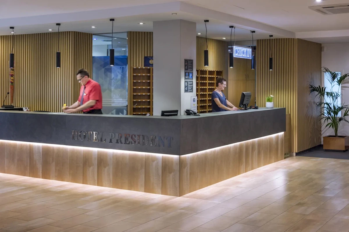 Każdy pokój w hotelu President dysponuje balkonem. Pokoje wyposażone są w klimatyzację, minibar oraz telewizor z dostępem do kanałów telewizji satelitarnej.Wyżywienie