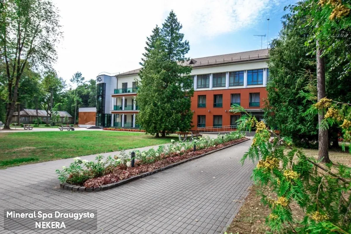 konsultację z lekarzem medycyny fizykalnej i rehabilitacji, codziennie 5 zabiegów po jednym z każdej z grup: 1). Kąpiele lecznicze i okłady: kąpiel w wannie z naturalną wodą mineralną o wysokiej mineralizacji pochodzącą z jednego z najbardziej słonych żródeł na Litwie - Draugyste (kąpiel perełkowa, kąpiel ziołowa, kąpiel perełkowo-ziołowa, kąpiel terpentynowa, kąpiel terpentynowo-ziołowa, każda ok. 15 min.), okłady borowinowe, błotne lub aplikacje parafinowe (20 min.) 2). Masaże: masaż wodny / masaż klasyczny głowy, karku ramion (15 min.) / masaż klasyczny pleców (15 min.), elektroterapie, thermoterapie. 3). Kinezyterapia: Aqua aerobik (30 min.), grupowa gimnastyka terapeutyczna na siłowni (z wyj. dni świątecznych), ćwiczena terapeutyczne ze specjalistycznym sprzętem na siłowni (z wyj. dni świątecznych), grupowe ćwiczenia terapeutyczne w basenie (z wyj. dni świątecznych) 4). Basen: basen kryty, jacuzzi, prądy podwodne, ziołowe łaźnie parowe, sauny, itp. 5). Fizykoterapia: prądy stymulacji impulsywnej lub przeciwbólowe, prądy interferencyjne, ultradżwięki, terapia polem magnetycznym Bemer3000, laser magnetyczny, terapia światłem za pomocą aparatu Bioptron, inhalacje solą himalajską (30 min.). Dodatkowo płatne: koktajle ziołowe oraz woda mineralna. Za dodatkowa opłatą: konsultacje z lekarzami różnych specjalizacji, badania kliniczne, biochemiczne, rentgen, echo serca, badania orgganów wewnętrznych, procedury terapeutyczne i inne, zgodnie z dostępnym cennikiem zabiegów i procedur.Możliwe pobyty