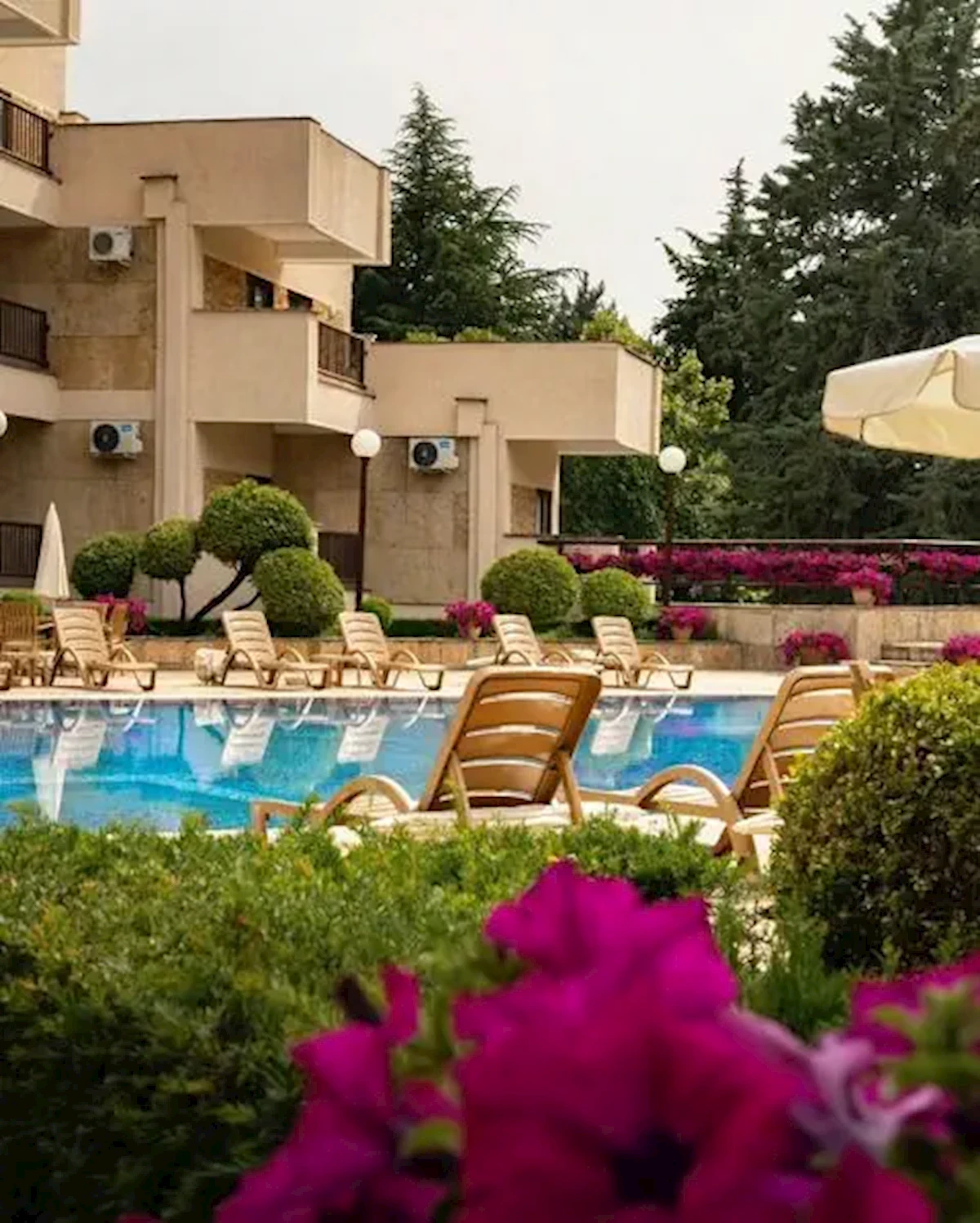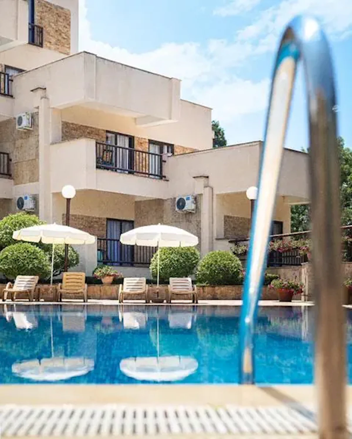 - basen- leżaki i parasole słoneczne dostępne przy basenie
