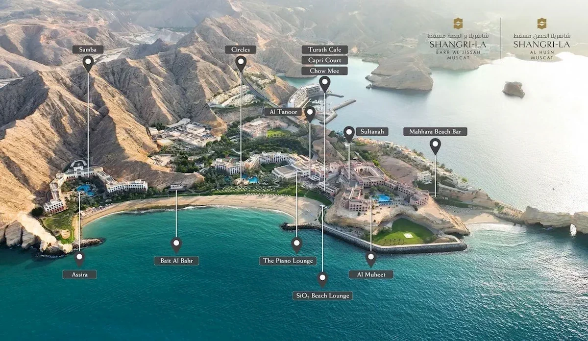Na terenie komplesu skłądającego się z trzech hoteli: Shangri-La Al Husn i Shangri- LaBarr Al Jissah: Al Bandar i Al Waha znajdują się niżej wymienione restauracje i bary: