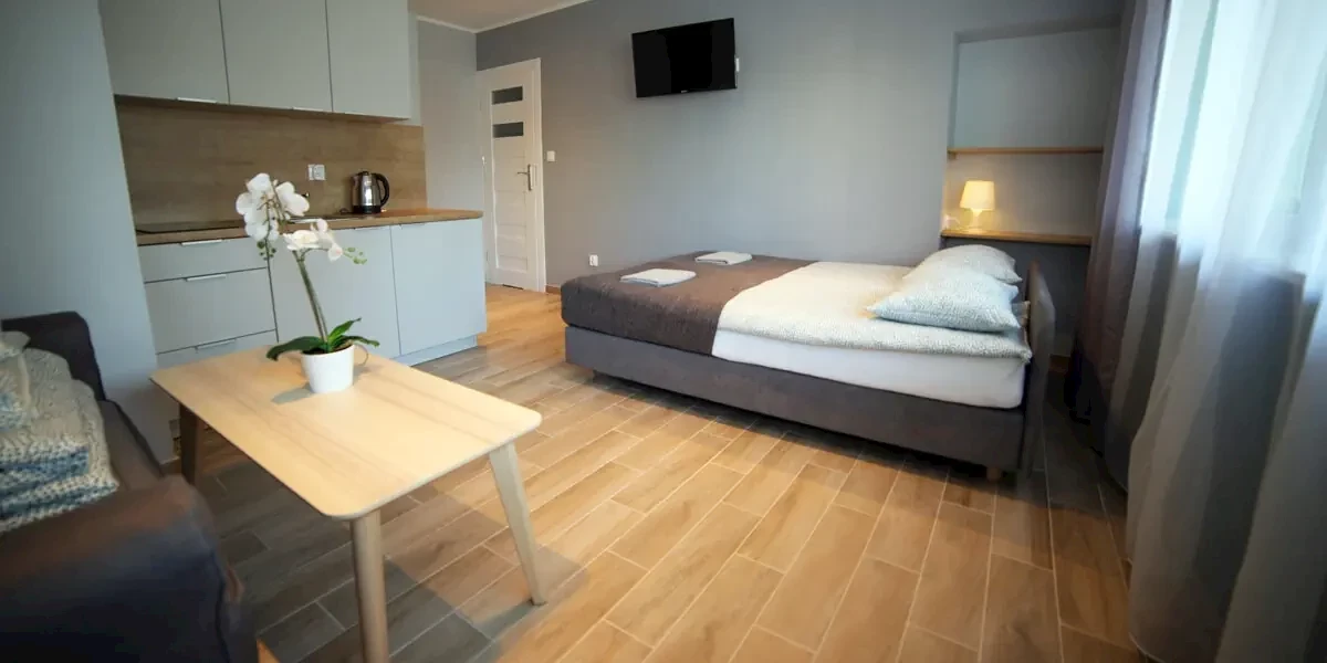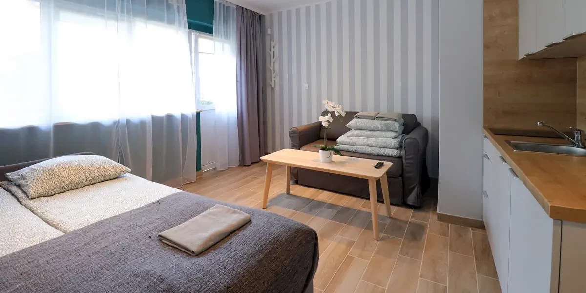 Kameralny pokój z aneksem kuchennym i dodatkową sofą. W wyposażeniu: smart TV, wifi, czajnik, lodówka, kuchenka, naczynia, ręcznikiPokój 2+1 Comfort parter