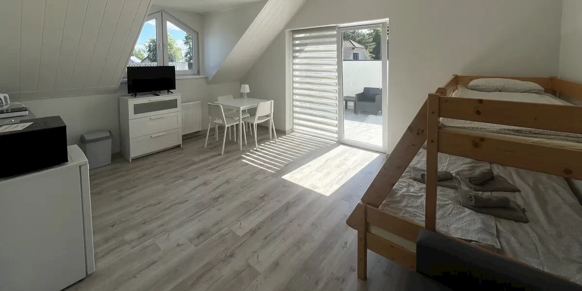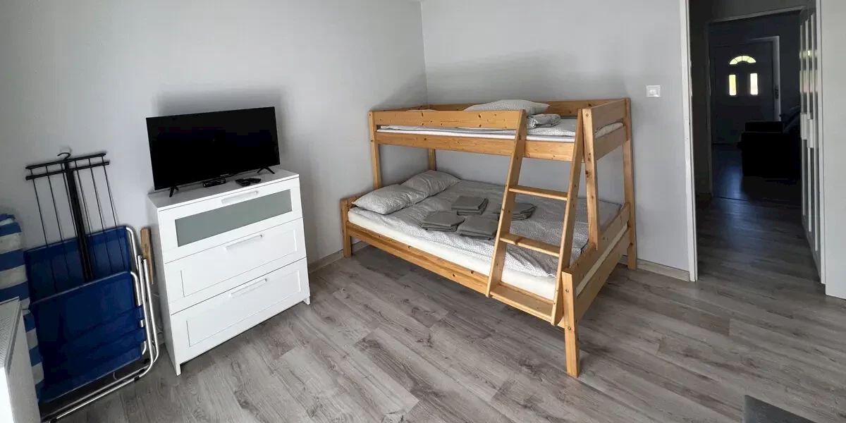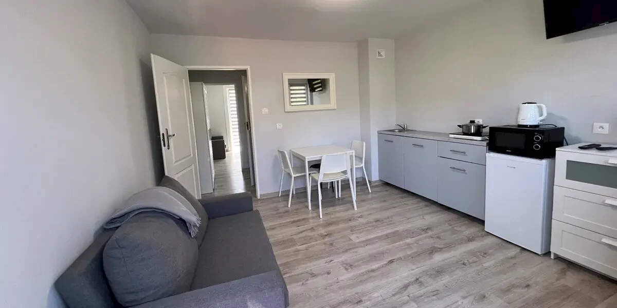 Pokój 4 os. z balkonem lub tarasem. W wyposażeniu: TV, aneks kuchenny z czajnikiem, mikrofalówką, zlewem, lodówką, garnkami, kuchenką, sztućcami, talerzami, parawan i leżak. W łazience są dostępne ręczniki.Oferta