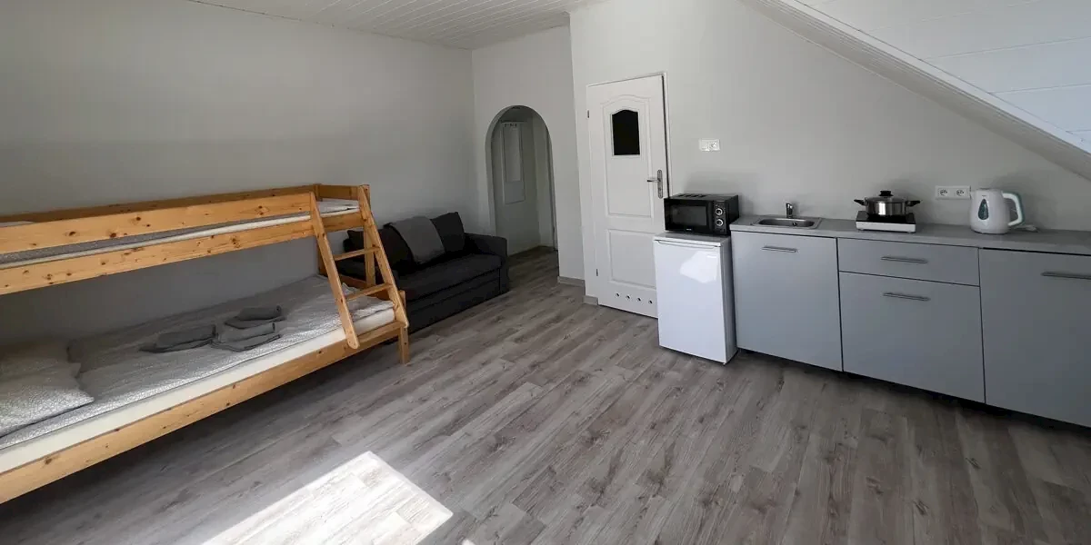 Domek z tarasem lub balkonem, 2 pokojami i łazienką. W wyposażeniu: 2xTV, aneks kuchenny z czajnikiem, mikrofalówką, zlewem, lodówką, garnkami, kuchenką, sztućcami, talerzami, parawan i koc. W łazience są dostępne ręczniki.Apartament 2-pokojowy