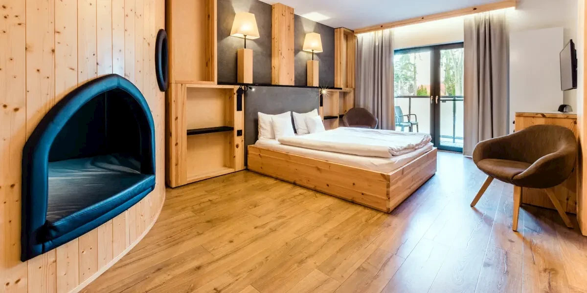 Komfortowy, obszerny pokój z widokiem na las. Pokój zlokalizowany w części A kompleksu. Polecany dla rodziny 2+1 lub 2+2. W pokoju znajduje się rozkładana sofa (pełni funkcję łóżka dla 2 dzieci lub 1 osoby dorosłej). Część A kompleksu to kameralny dwukondygnacyjny budynek bez windy, połączony z całym kompleksem komfortowym ogrzewanym łącznikiem bez barier architektonicznych. W budynku znajdują się Baby & Mini Club oraz Sala Animacyjna. Wszystkie pokoje hotelowe posiadają oddzielny balkon typu loggia od strony lasu z krzesłami ogrodowymi.Pokój 3-os. standard plus