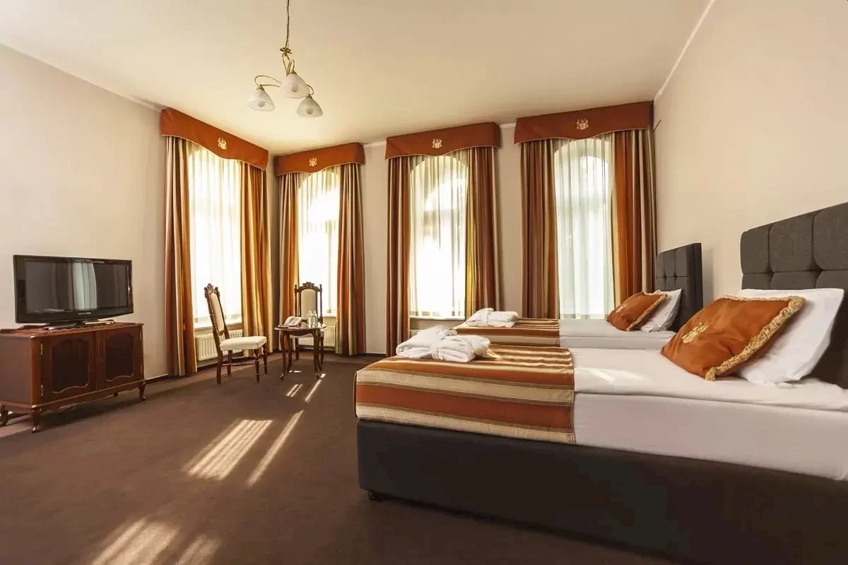 200 miejsc noclegowych w pokojach 1-, 2- i 3- osobowych oraz apartamentach z pełnym węzłem sanitarnym o zróżnicowanym standardzie, część przystosowana dla osób niepełnosprawnych (w części pałacowej), wyposażonych w TV SMART, czajnik elektryczny, ręczniki. ATTIC – pokoje na ostatnim piętrze budynku z urokliwymi skosami oraz oknami pałacowymi i oknami zwanymi ,,bawole oka’’.Do dyspozycji Gości