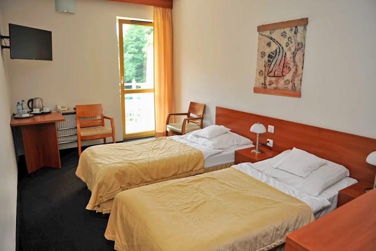 Obiekt przystosowany do potrzeb osób niepełnosprawnych. Jedno dziecko do 6 lat przy 2 pełnopłatnych opiekunach bez świadczeń gratis. Dzieci do 12 lat – 3 posiłki oraz nieograniczony wstęp na basen, pobyt bez zabiegów. Parking niestrzeżony ok. 20 zł,-/doba. Dla osób wymagających konsultacji lekarskiej – początkowe badanie lekarskie w obiekcie sanatoryjnym za dodatkową opłatą 140 zł,-. Taksa klimatyczna płatna dodatkowo – ok. 5,-zł/os./dzień.NAŁĘCZÓW położony na Wyżynie Lubelskiej - 212 m n.p.m., stanowi część Kazimierskiego Parku Krajobrazowego urzekającego polskimi plenerami, architekturą, imponującą historią. Atrakcją tych okolic jest sieć wąwozów lessowych. Umiarkowane przewietrzanie, duża wilgotność i nasłonecznienie tworzą specyficzny mikroklimat Nałęczowa. Sprzyja on obniżaniu ciśnienia tętniczego krwi i zmniejszaniu dolegliwości chorób układu krążenia (choroba wieńcowa, nadciśnienie tętnicze i nerwica sercowo – naczyniowa, rodzinne obciążenie chorobą układu krążenia), a magnezowe wody mineralne uzupełniają niedobory w organizmie spowodowane stresem. Leczy się tu również choroby układu ruchu. Dostępny jest pełny zakres zabiegów hydroterapeutycznych i fizykoterapeutycznych. Na gości przyjeżdżających do Nałęczowa czeka zabytkowy park, Palmiarnia, źródła wód mineralnych, SPA, kompleks basenowy ATRIUM z atrakcjami wodnymi (należący do Uzdrowiska Nałęczów) również bogaty program kulturalny