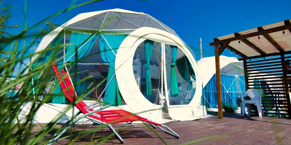 Całoroczny domek sferyczny w kolorze różowym (36 m2) to niesamowity domek z widokiem na gwiazdy i rollercoastery! Idealny dla osób poszukujących nietypowego noclegu najbliżej parku rozrywki Energylandia! Domek posiada 1 sypialnię i salon z rozkładaną sofą, aneks kuchenny, stół jadalniany, łazienkę i taras. W wyposażeniu: klimatyzacja z funkcją grzania i chłodzenia, TV, WiFi, pościel. W kuchni: płyta indukcyjna, lodówka, zamrażarka, czajnik elektryczny, kieliszki do wina, akcesoria do grillowania, herbata, sól, pieprz. Ponadto szafa ubraniowa, stolik nocny, zabawki dla dzieci, wieszaki, moskitiera, czujnik dymu, czadu, gaśnica. W łazience: prysznic, WC, ręczniki, suszarka do włosów. Na tarasie leżaki plażowe, huśtawka, stół i krzesła, grill. Domek nr 16Oferta