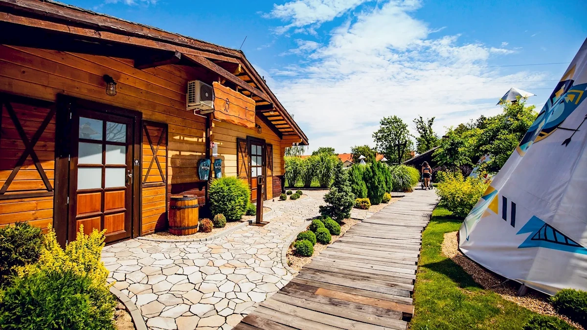 - ponad 700 miejsc noclegowych w różnorodnej zabudowie: 40 indiańskich tipi, 40 kowbojskich wozów i 40 domków szeryfa (parterowe lub piętrowe)