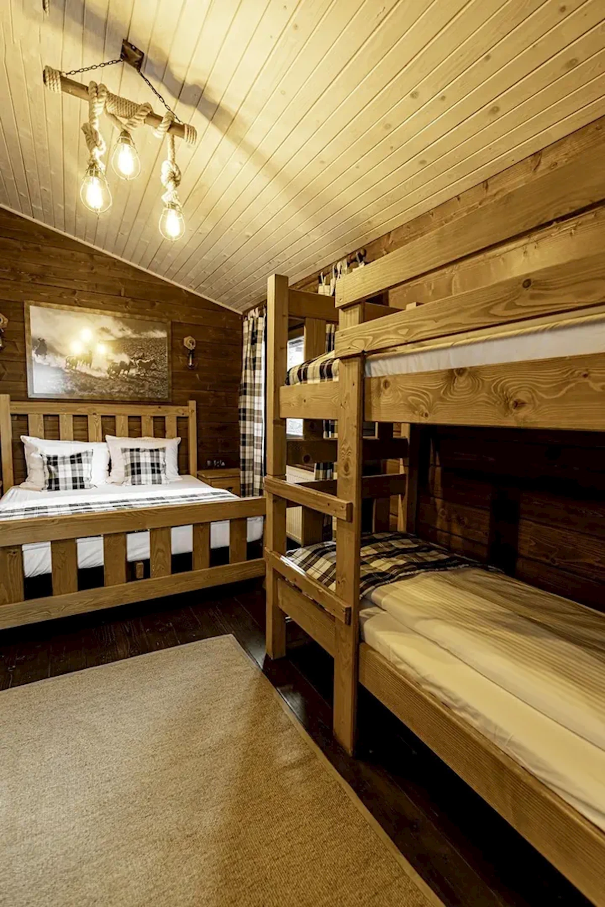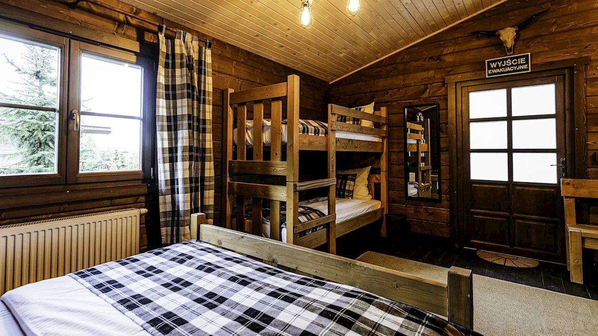 - dla 5-6 os. (łóżko małżeńskie, łóżko piętrowe i 2 łóżka pojedyncze na antresoli)