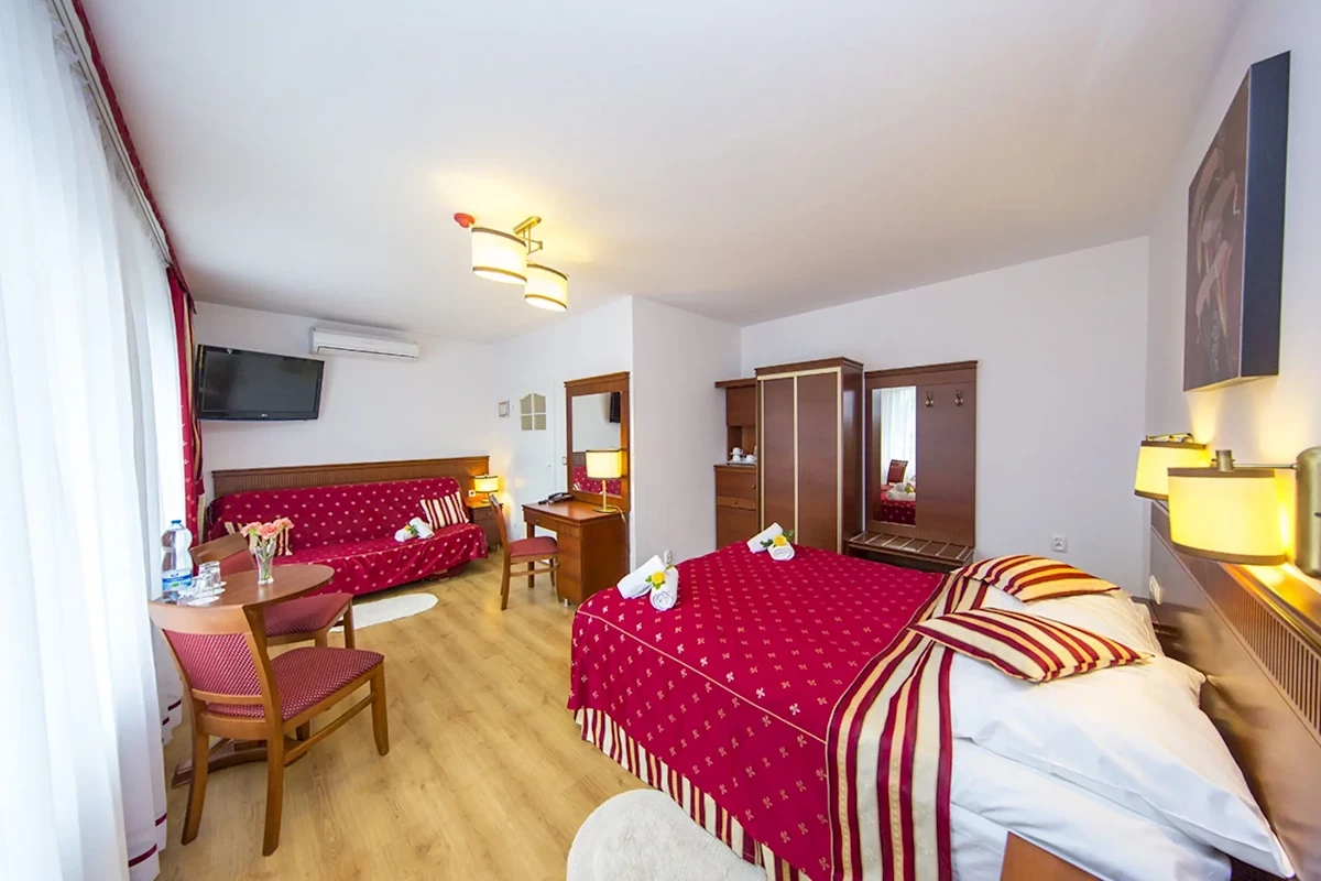 7 nocy, 1 x 1,5h na pobyt relaks w strefie Wellness dla całej rodziny (sauna fińska, sanarium, świat jacuzzi – kąpiele), łaźnia parowa i inhalacje Thalasso w grocie z wodospadami (zewnętrzna, czynna od 29.05-16.09), nielimitowane korzystanie z Aquaparku, korzystanie z siłowni, sport – aqua aerobik, zajęcia ruchowe w basenie, korzystanie z kortu tenisowego oraz boiska sportowego, zewnętrznych placów zabaw, Wesołe Miasteczko, rodzinny program animacyjny (warsztaty plastyczne oraz kulinarne, koedukacyjne zabawy itp.) DLA DZIECI – niespodzianka w pokoju (do 8 lat), 1 x pobyt malowanie twarzy (do lat 8), ozdobny tatuaż na rękę (9-15 lat), Małpi Gaj – 2 x po 2,5h/pobyt (4-15 lat), Strefa Malucha 2 x po 2,5h/pobyt (0-4 lata), Klockarnia 1 x 2,5h na pobyt (do 15 lat). DLA RODZICÓW – 1 x pobyt masaż fizykoterapeutyczny Wellsystem Hydro Jet Medical.Informacje dodatkowe