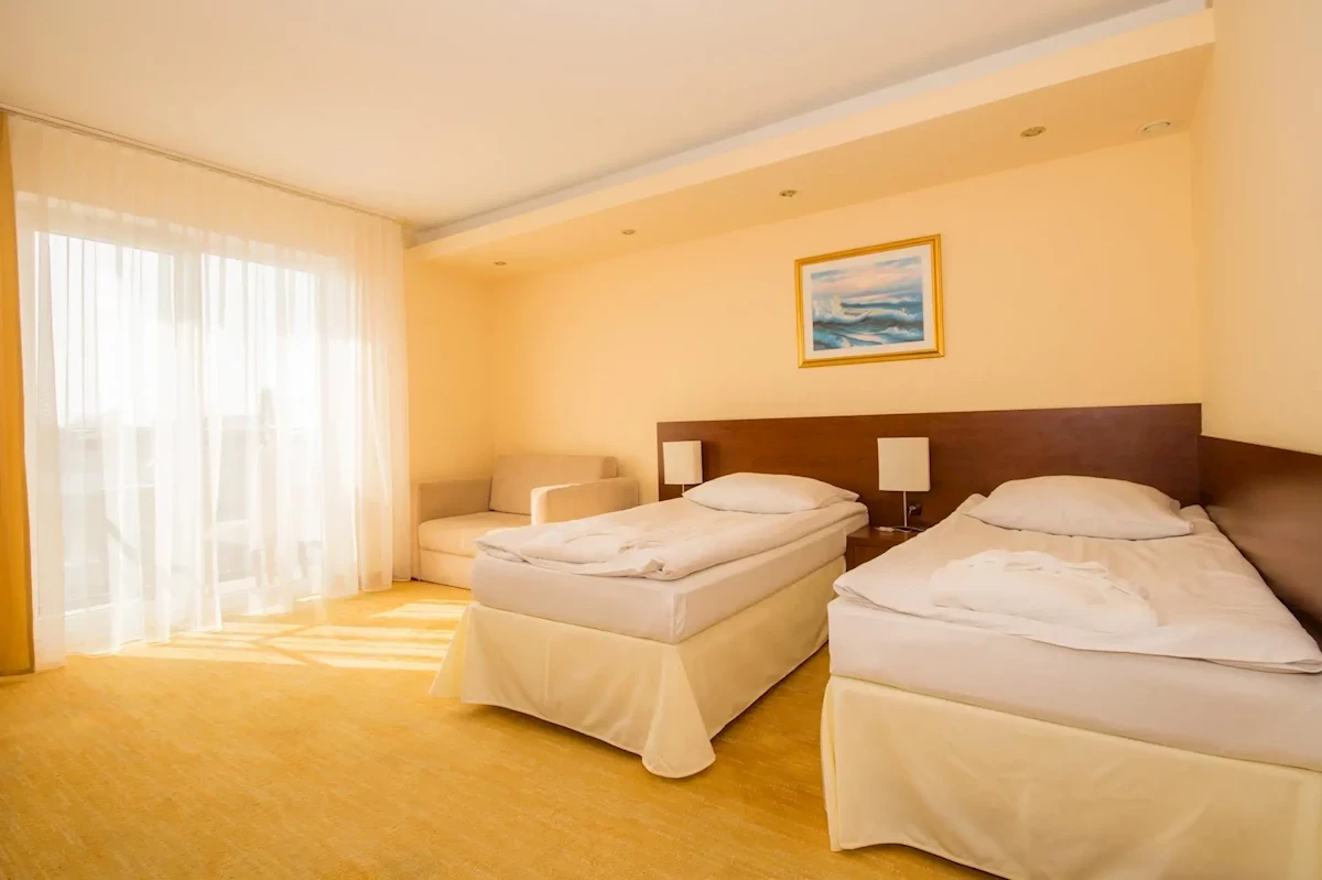 Dużą liczbę eleganckich i wygodnych apartamentów przygotowano w kilkupiętrowym budynku hotelu Król Plaza Spa & Wellness, w którym znajdują się windy. Wszystkie pokoje mają taki sam układ, składający się z pomieszczenia sypialno-dziennego (łóżko podwójne, kanapa rozkładana, stolik, szafa), aneksu kuchennego (mikrofalówka, kuchenka, lodówka), łazienki (prysznic, wanna, umywalka, WC) oraz balkonu (krzesła i stolik). Można rezerwować apartamenty standardowe oraz family, które mają większy metraż i dodatkowe łóżko. W skład wyposażenia każdego pokoju wchodzi ponadto zestaw kosmetyków, suszarka do włosów, telefon stacjonarny, telewizja satelitarna, czajnik elektryczny, klimatyzacja/ogrzewanie (sezonowo). Wszystkie apartamenty są codziennie sprzątane (w cenie).