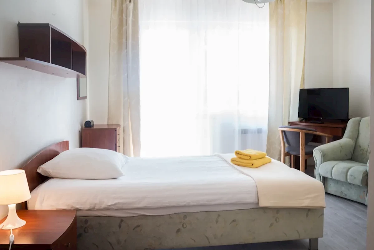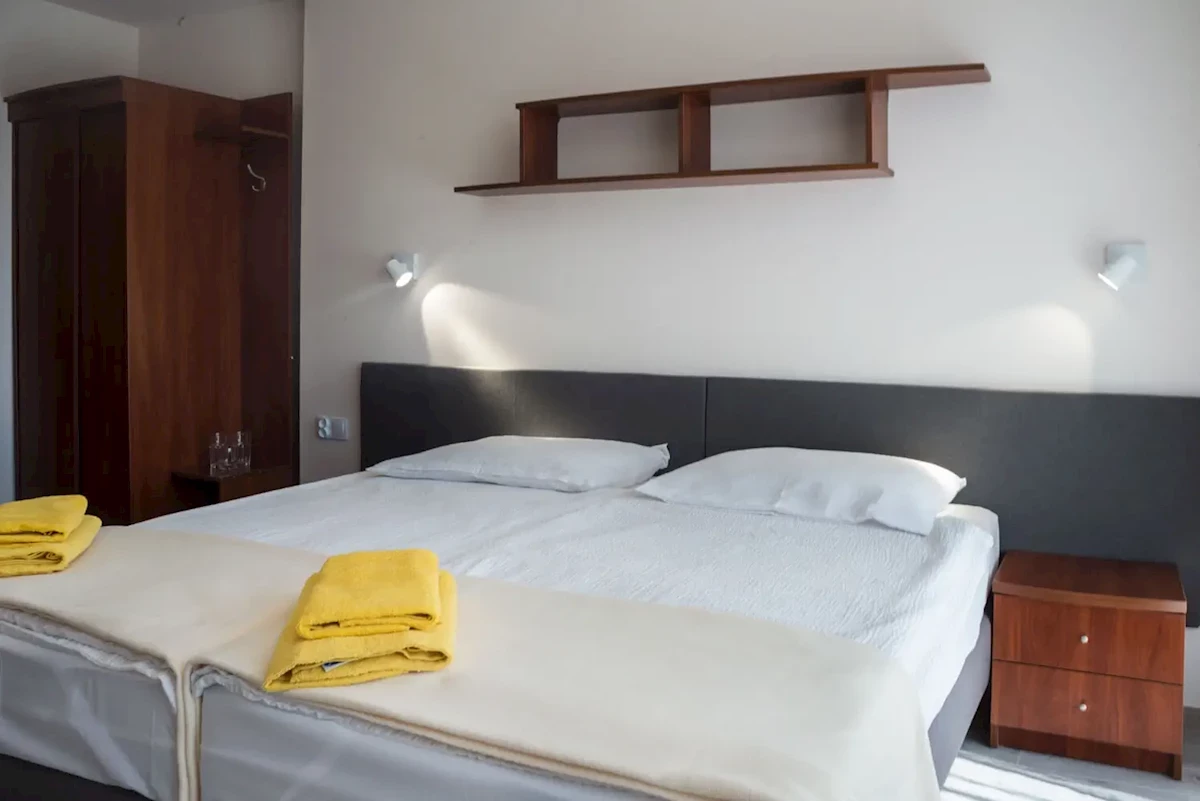 ok. 350 miejsc w wygodnych pokojach 2 os. z łazienkami, pięknymi balkonami i całym niezbędnym wyposażeniem obejmującym nowoczesny telewizor, lodówkę, a także stolik, przy którym można zjeść śniadanie przed wyruszeniem na plażę. Dla rodzin z dziećmi pokoje 3-osobowe i pokoje typu studio 2+2.Do dyspozycji Gości